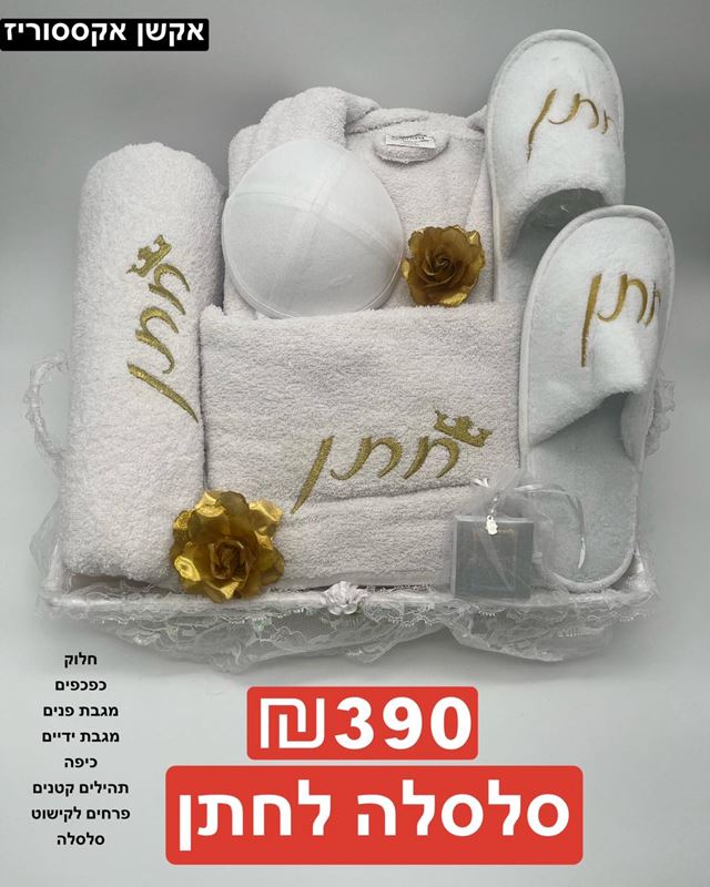 חלוק מגבת ONE - SIZE , כפכפים מגבת ONE - SZE , כיפה , 3 מגבות ידיים , מגבת גוף , מגבת פנים , תהילים קטנים , פרחים לקישוט , סידור , כוס שבירה לחופה , כוסות שמפניה , קולב מעוצב , שלט MRS , סלסלה