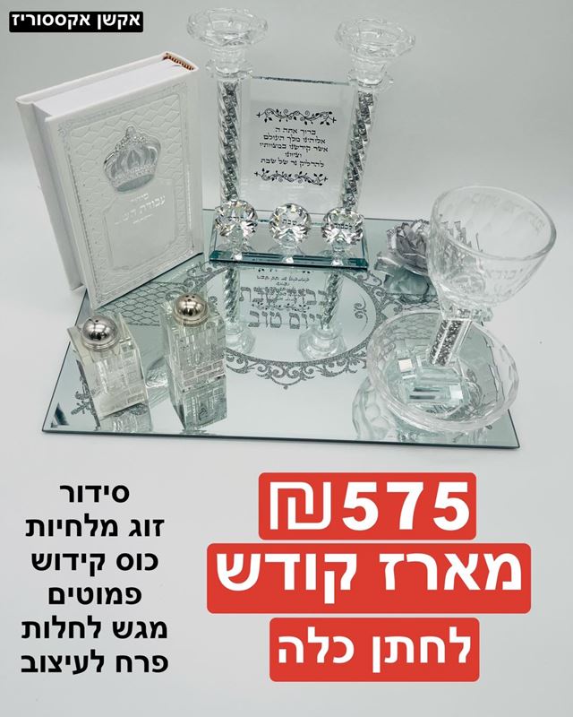 סידור, זוג מלחיות, כוס קידוש, פמוטים, מגש לחלות, פרח לעיצוב