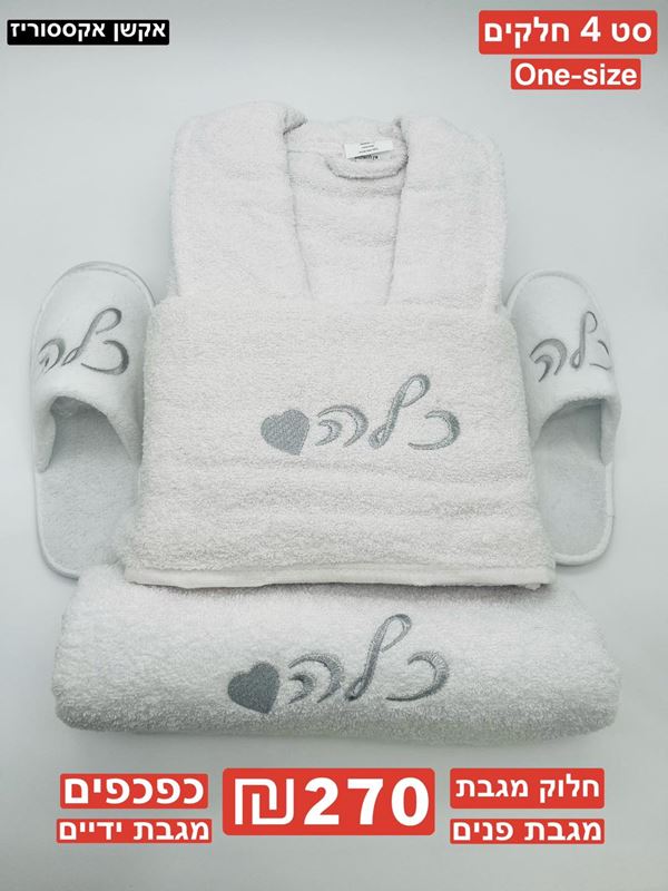 מארז 4 חלקים לכלה 100 אחוז כותנה חלוק מגבת ONE SIZE מגבת פנים מגבת ידיים כפכפים ONE SIZE